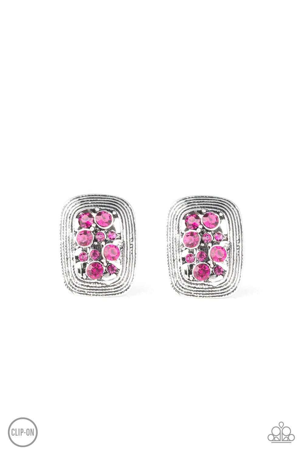 Sparkling pink rhinestones collected inside a border of silver, creating a refined frame. Earring attaches to a standard clip-on earring.