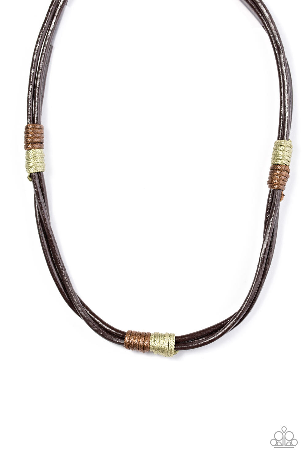 Brown and white twine knots around strips of leather, creating urban accents. Features a button loop closure.
