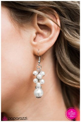 Dainty white pearls gracefully fall from the ear, creating an elegant pearl chandelier. Accented with a ring of glittery white rhinestones, a large pearl swings from the bottom of the display, elongating the elegant design. Earring attaches to a standard fishhook fitting.